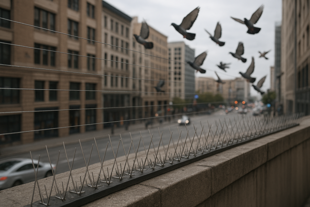 Effective spikes, netting, and wire systems to keep birds away.